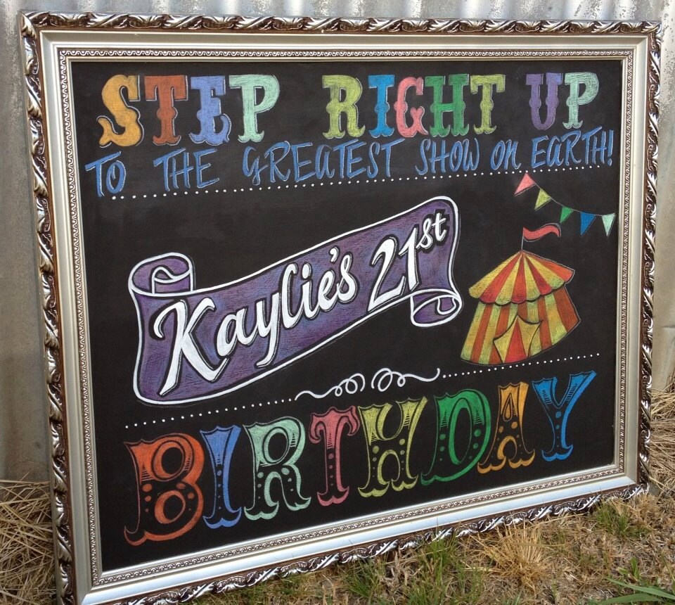 Circus themed chalkboard birthday sign. THIS SIGN DOES NOT COME FRAMED. 90 x 60 cm chalkboard birthday sign. Name and birthday can be changed to suit. FRAME NOT INCLUDED.